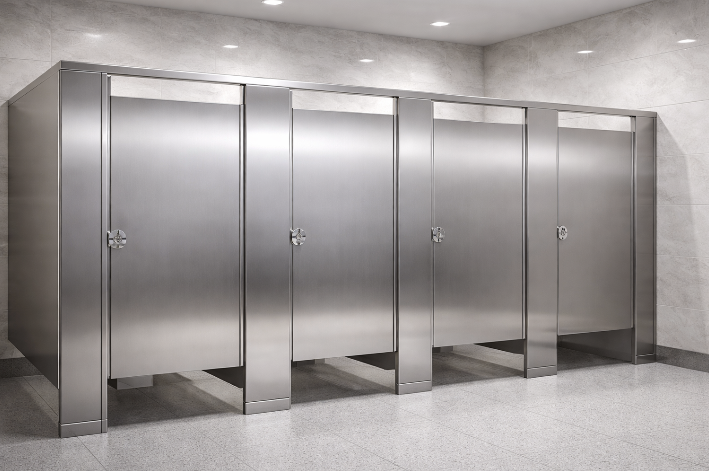Stainless steel partitions offer superior strength and impact resistance. Pilasters, panels, and doors fabricated from stainless steel provide rigid support, reducing flex and minimizing hinge stress during daily use.